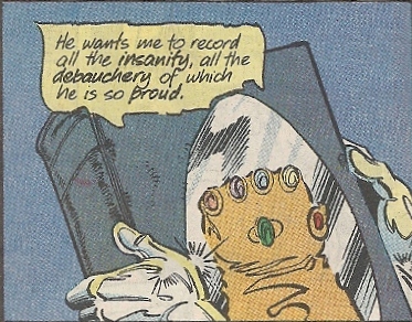 In this What Iffy Surfer dream (continuing a storyline from the previous issue), Thanos has conquered the universe and made the poor Mr. Radd his scribe (complete with leash and studded dog collar), in charge of writing the Book of Thanos (or something). The Thanos Dianetics, one supposes. Whatever you call it, the Infinity Gauntlet decoration on its cover is pretty nifty: