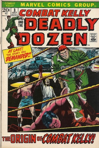 For those of you unfamiliar with this burly red-head and his unflattering bowl cut, here’s a primer. Like much of fictional co-traveller Nick Fury’s early run, he spewed from the typewriter and pencils of Gary Friedrich and Dick Ayers (and, in this issue, Mike Esposito inks). Unlike Fury, who’s had a long, LONG shelf-life, and just made an appearance on the big screen in The Avengers, Kelly’s title only lasted for a run of nine issues in the early 1970s. Also like Fury, he had a squad of colorful grunts at his side (the Deadly Dozen), but in this case they were rough parolees getting a second chance at life by robbing Nazis of theirs. Got all that?