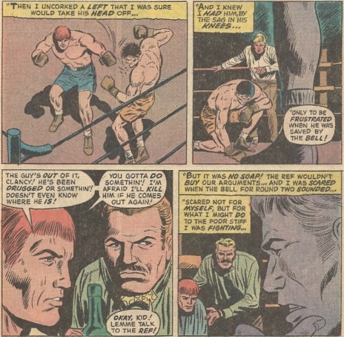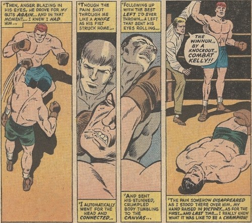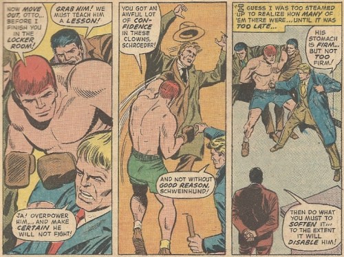 This issue has a fairly entertaining look at how Combat Kelly got into his wartime predicament. (Sort of. More on that in a moment.) And it has boxing. Boxing from the days when no one gave a rat’s ass about concussions. “Rub some dirt on it and take a salt tablet.” And not only boxing, but boxing against a towering, devious Nazi opponent, dredging up shades of the Cold War’s Rocky IV and its gloriously stupid fight. (Not to mention a slice of the real life Baer/Schmelling and Louis/Schmelling fights.)
