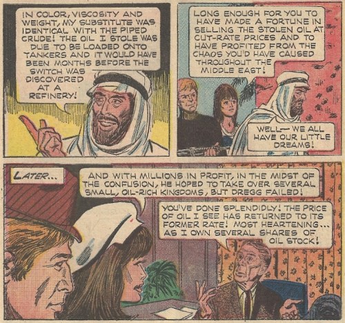 It all works out in the end, though, as April escapes the harem and potential incineration in a vat of crude (thanks to Mark’s help, natch). They then dodge old biplanes and men riding camels, et cetera, et cetera, and get their man. And the sheik’s cheap oil? Which we would like very much to have, if you don’t mind, old comic book? Turns out it was all a house of cards: