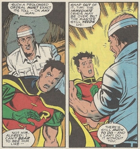 I don’t think any of us like to see Batman whiney, in a neck brace and on his back (in two years Christopher Reeve’s riding accident would bring a terrible reality to superhero paralysis), and Tim Drake’s tears probably echoed the reactions of many people in the reading audience. Which makes Alfred’s Airplane!-esque SNAP OUT OF IT advice to young Master Tim applicable on a meta level: