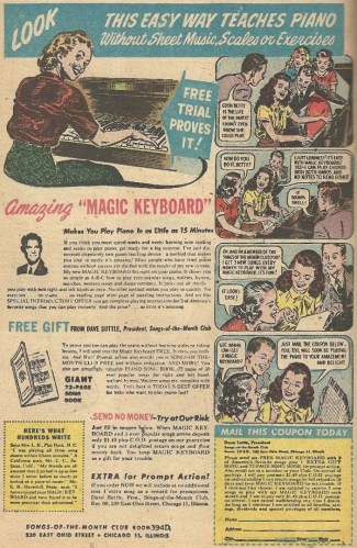 If the Rhythmagraph method of learning to play the piano leaves you cold — and how could it not, with its implied promise of cruel instructors rapping knuckles with every minor flub — then this comely young lass surely presents a safe haven. The “Magic Keyboard” sounds a lot like people who take a vision test after memorizing the eye chart. But you’ll be the smash hit of all piano-centric parties, and draw the loving attention of every suit-and-tie-wearing young man. Go get ’em, champ.