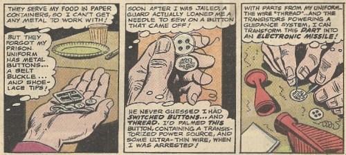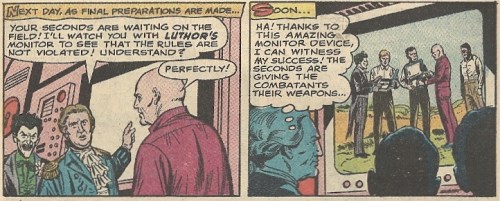 Before we can get to that point in the story (Script: Jim Shooter, Pencils: Curt Swan, Inks: Esposito), there’s a whole pile of preliminaries to go through. You see, recidivist Luthor is in the hoosegow for the 179th time (a ballpark figure), and he has to figure out a way to bust on out of there. This is complicated by the fact that the guards refuse to provide him with anything that his criminal genius can cobble into a means of escape. That is, until an obliging guard gives him a dart set for a bit of recreation. Your tax dollars at work, folks. Luthor immediately goes full MacGyver (though, being a criminal, he naturally cheats a bit):