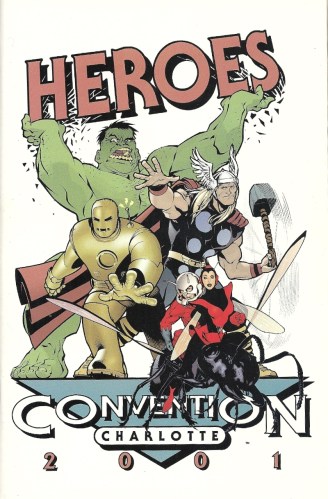 This is a little slice of comic book ephemera, a part of the convention scene that forms such an integral corner of the industry. The Heroes Convention is a long-running Charlotte gathering, founded by the Heroes Aren’t Hard to Find people, and it’s been in existence long enough to produce a meaty program to go along with the proceedings. Hence what you see before you. This 2001 edition of the in-house magazine has what you’d expect from a convention program, with thank yous, floor plans and look who’s showing up! blurbs in abundance. It’s a nice, thick little chotchke to go with whatever other swag gets carried out of the convention center.