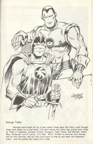The Avengers were an artistic theme within (and without) this edition, as artists appearing — and some not appearing — at the convention contributed bits of artwork. Certain entries are quite appealing, some not so much so. For some reason I really like the look of Iron Man in this George Tuska (he of many yeoman-like House of Ideas strips) one-pager. Maybe it’s the mouth in place of the usual slit: