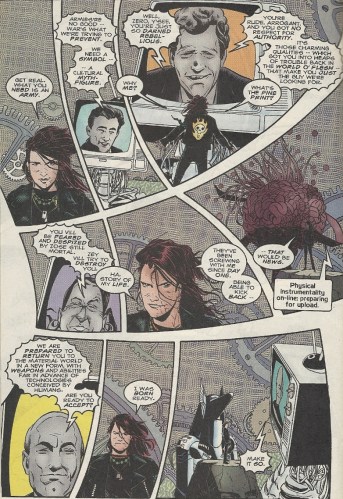 This first issue, much like the Punisher introduction, tells the origin story through flashback. Which is probably just a coincidence. OR IS IT? Whatever the reasoning, this sequence is moderately entertaining, as our hacker hero’s brain takes a Lawnmower Man trip and finds its way into a corner of cyberspace populated by sentient programs called the Ghostworks. They make the man who was once Kenshiro (I almost typed Zefram) Cochrane an offer he can’t refuse (a chance for righteous vengeance on his killers that will help the Ghostworks cause as well), and use some familiar faces, including David Letterman and Jean-Luc Picard, to do the convincing: