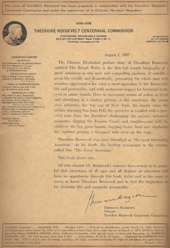 Another of the Classics Illustrated Special Issues (we’ve looked at a paean to atomic energy here before), 1957’s The Rough Rider was produced in cooperation with the Theodore Roosevelt Centennial Commission, which worked to commemorate the hundred years since Roosevelt’s birth by spreading the Gospel of Teddy. (It sounds like a nice organizational title people could put on their C.V. without having to do much work.) You want a mission statement from Director Hermann Hagehorn for this book? Of course you do:
