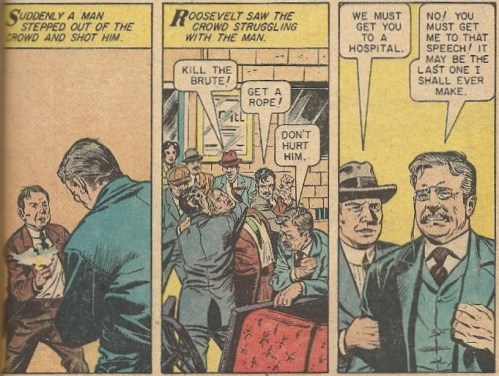 Even with the almost totally unalloyed admiration, even with “mercy” killings of young, cute, big-pawed lions, there are more than enough special moments from Roosevelt’s life to fill out the comic and make you understand what a larger than life character he was. Like oh, say, the time he got shot and decided to go give a speech anyway: