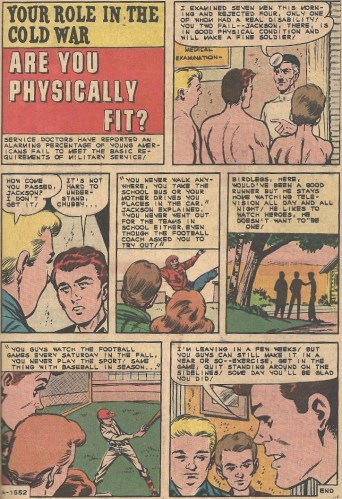 This pair of odd public service announcements (both illustrated by Rocco “Rocke” Mastroserio) were found in the Konga issue I discussed here over the weekend. What with the giant ape wrecking jet fighters and destroying missile bases, sending communists and their hammers and sickles scurrying, they both felt like overkill. But this was the early 1960s, when the Cuban Missile Crisis threatened to turn the globe into a charred cinder, so if there was ever a time to be paranoid, I guess this was it.
