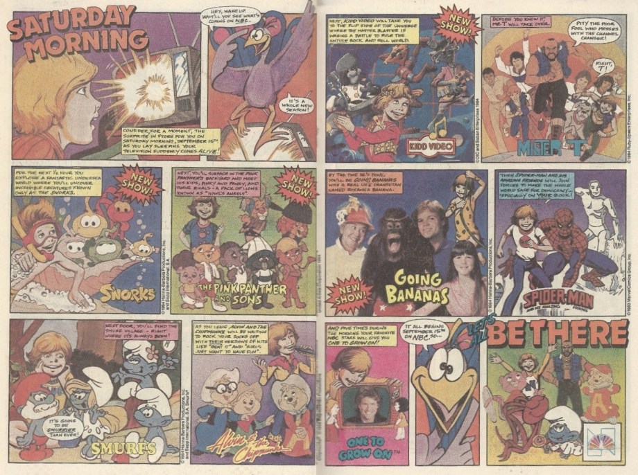 Smurfs. Snorks. Spider-Man. Mr. T. Pink Panther (sons?). Sober David Hasselhoff. NBC. Saturdays. 1984. BE THERE.