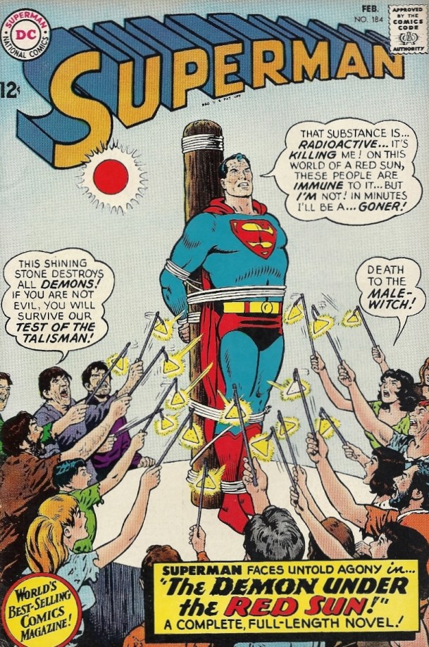 Here’s Kal-El rendered powerless by a red sun and trussed to a pole for the 517th time. Awesome. – Superman #184
