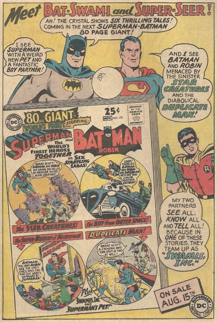 If Batman and Superman are the World’s Finest tag team, then might I suggest that Bat-Swami and Super-Seer are the World’s Dopiest? Wouldn’t it be better (worse) if Superman had a giant Carnak the Magnificent turban on his noggin? I mean, if you’re going to go this route, you might as well have all the bells and whistles. Also, is “My Two Partners” Robin’s equivalent of My Two Dads?