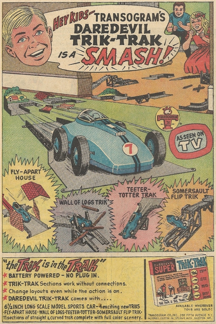 The girl in the upper right-hand corner doesn’t look happy. She looks terrified, less rooting the tiny electric car on than fretting over its imminent destruction, aghast that the hellish Trik-Trak, with its logs and houses and somersaults (who’s driving, the Elwood Blues?), will be its ultimate doom. It almost beats throwing a shed snake skin on her.