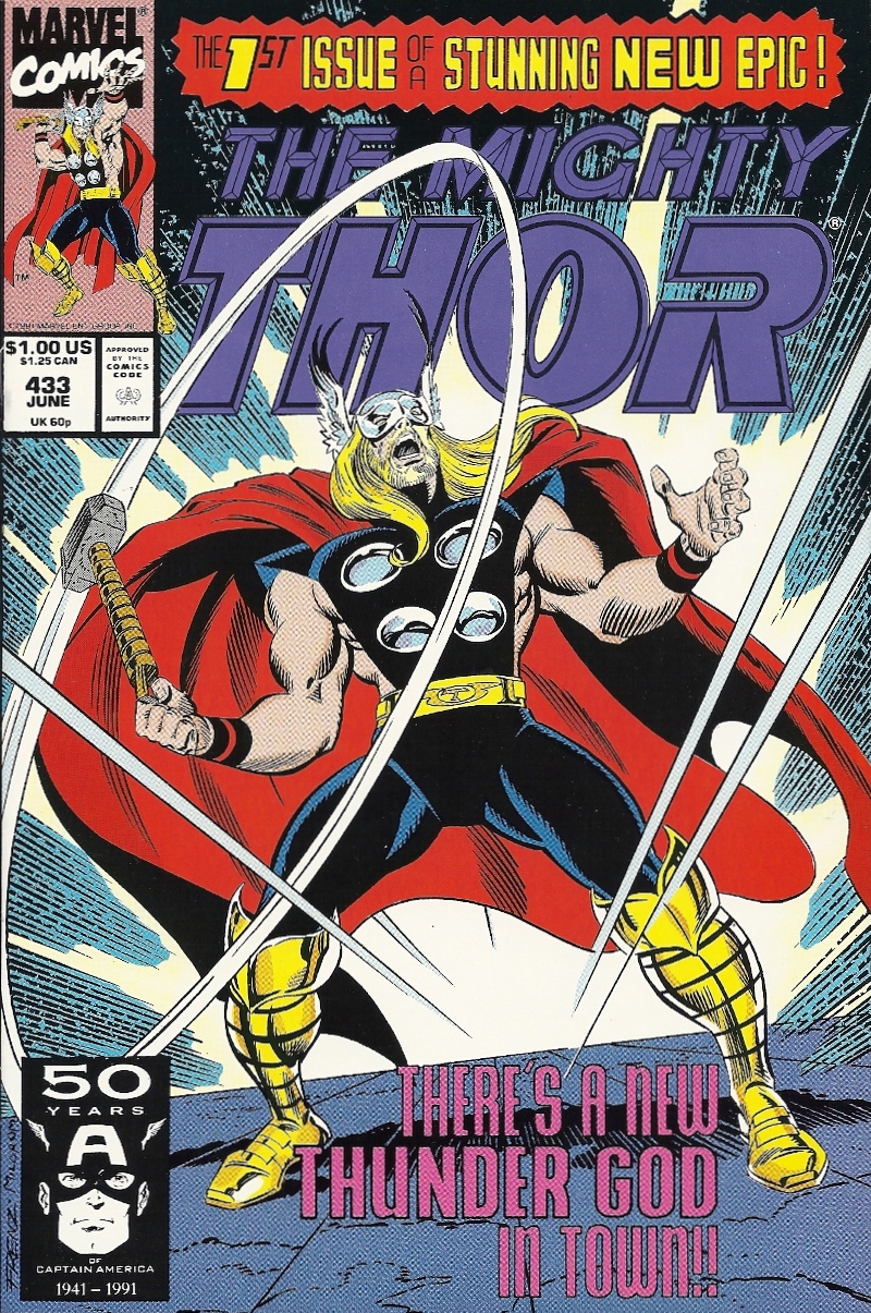 Issue #433 was his first solo day on the job, and he’d continue as Thor until #458, when the real McCoy took back Mjolnir and Masterson took on his long-term role as Thunderstrike. His run as the big guy was thus relatively brief, but it lasted more than a couple of issues, which meant that it was by no means the shortest of this sub genre — which in turn meant that it must have had something going for it. You can see some of that in this first New Thor installment, which, as the cover promises, is the beginning “of a stunning new epic!” It’s not all that stunning. It’s not all that epic. But it has a sense of humor about itself, and a sense of fun relative to the long and storied fictional career of the Thunder God. These are good things about something that’s distinctly not all that great.
