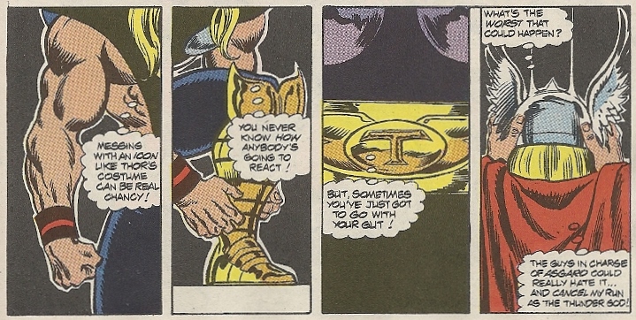 Then comes the big moment: Masterson — as Thor in street clothes — goes to the tailor to pick up his new costume (the one seen on the cover). Here he is suiting up, with an internal monologue that serves as a meta commentary on the comic book publishing biz: