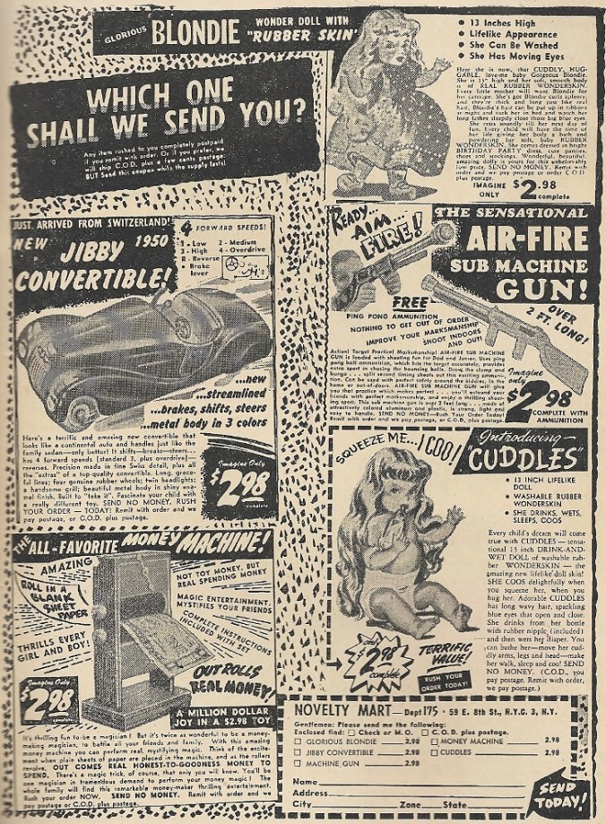 Your pick of a convertible, machine gun. counterfeiting machine, or hideous, horrifying dolls — enjoy, kids!