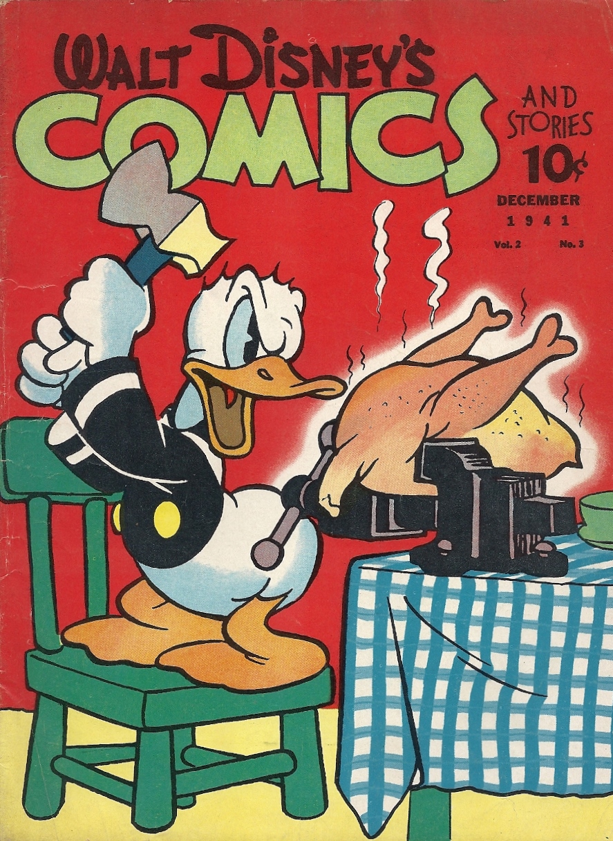 Happy Thanksgiving from Donald Duck, a hatchet and a turkey in a vise