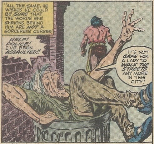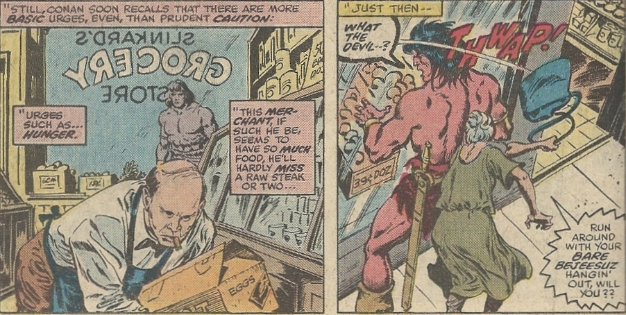 Conan arrives not only in the Big Apple, but the Big Apple on July 13, 1977. That’s the day/night of the infamous real-life big blackout, which is a nice bit of storyline synergy. Since it’s summer and it’s New York and the A.C. is kaput, his attire isn’t that out of place — this is, after all, the burg that would one day give us the Naked Cowboy. Still, his scant clothing and general beefiness draws some comments from those he encounters, including one lady who wonders if he might be Arnold Schwarzenegger. I realize Arnie was one of the few muscle men to have widespread fame at that point, but I’m still impressed by the prescience shown here for the casting of a film that wouldn’t hit theaters until 1983.