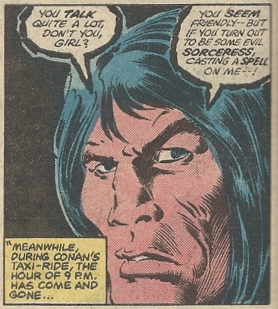 Conan wanders around (nearly crossing paths with Peter Parker and Mary Jane) and has the reactions that you’d expect when he confronts automobiles, confusing them with metallic monsters and lashing out as soon as one comes near. But he happens to strike a taxicab driven by what is perhaps the most attractive hack in the history of the universe: