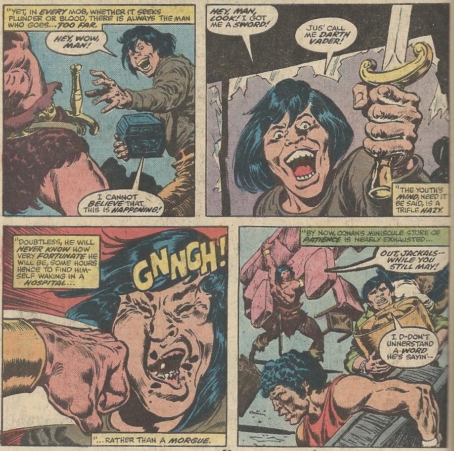 It’s not often that my dour face breaks into a wide smile while I’m reading a comic book. I enjoy them, but my pleasure usually registers internally. It’s even rarer for me to actually laugh out loud at a comic’s attempts at humor. This comic managed to do both. Throwing Conan the Barbarian into the modern day (1977 in this case) could either be a storytelling disaster or it could be a source of nigh-unending amusement. This is the latter, my dear readers. The latter.
