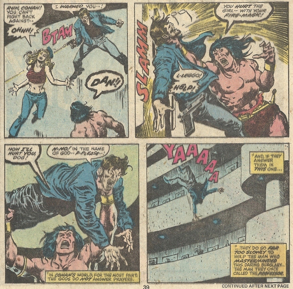 I enjoyed reading this comic more than I have any in recent memory. Really. Seeing and reading Conan’s reactions to modern life was a delight, and while not a whole hell of a lot really goes on in this story, it held my attention. Roy Thomas’s gifts were on full display here — there’s a fine line between stupidly fun and just plain stupid, and he walked it like a circus acrobat. Bravo. And the blending of Buscema’s and Chin’s styles made for some very attractive art. I’m not Buscema’s biggest fan, but I’ve always liked what he does with Conan, both here and in his proper title. The looks on the faces of the poor modern goons when confronted by this hulking dude were priceless, as were the images of their teeth getting knocked out and them being thrown out of buildings.