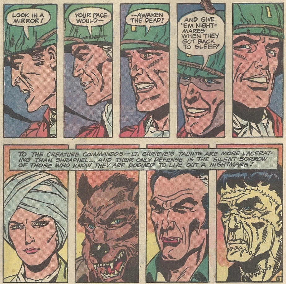 It’s with great sadness that I report that the Commandos story in this issue (“Doorway to Hell!”, written by Robert Kanigher with art by Fred Carrillo and Jerry Serpe) isn’t all that great, though you have to love how their normal minder, Lt. Shrieve, unrelentingly berates them for their gruesome appearances and abilities: