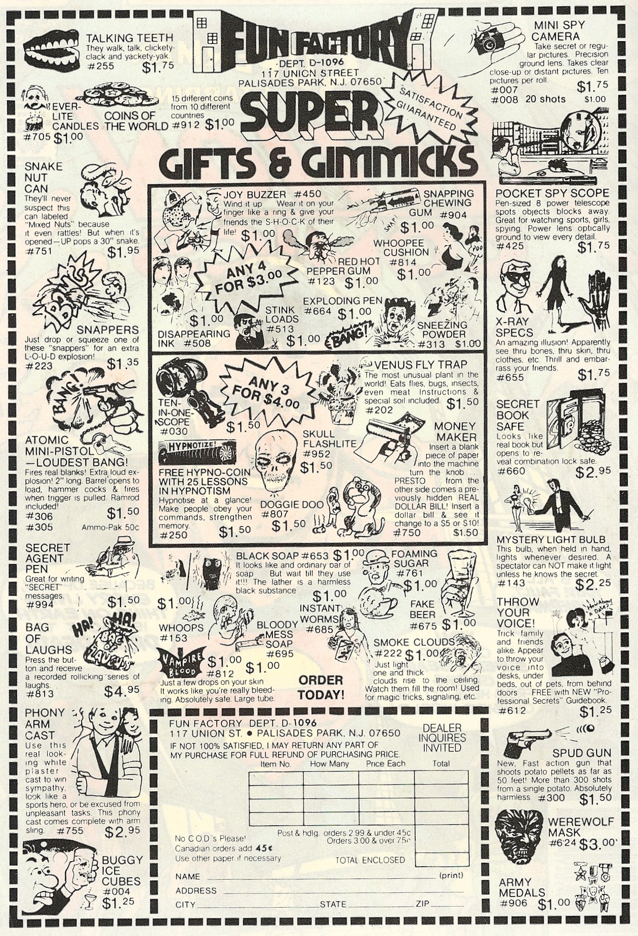 Comics don’t seem like comics without an ad for the various accoutrements of juvenilehood. I myself had several of these stupid things: the clacking teeth, the black soap, and a device that brought endless amusement for me and visiting friends, a whoopee cushion. The whoopee cushion may be the greatest invention in the history of humankind. It’s wonderful. I remember mine making the most spectacularly disgusting sounds you could ever possibly imagine, to the horror of my poor mother and the guffaws of my father.