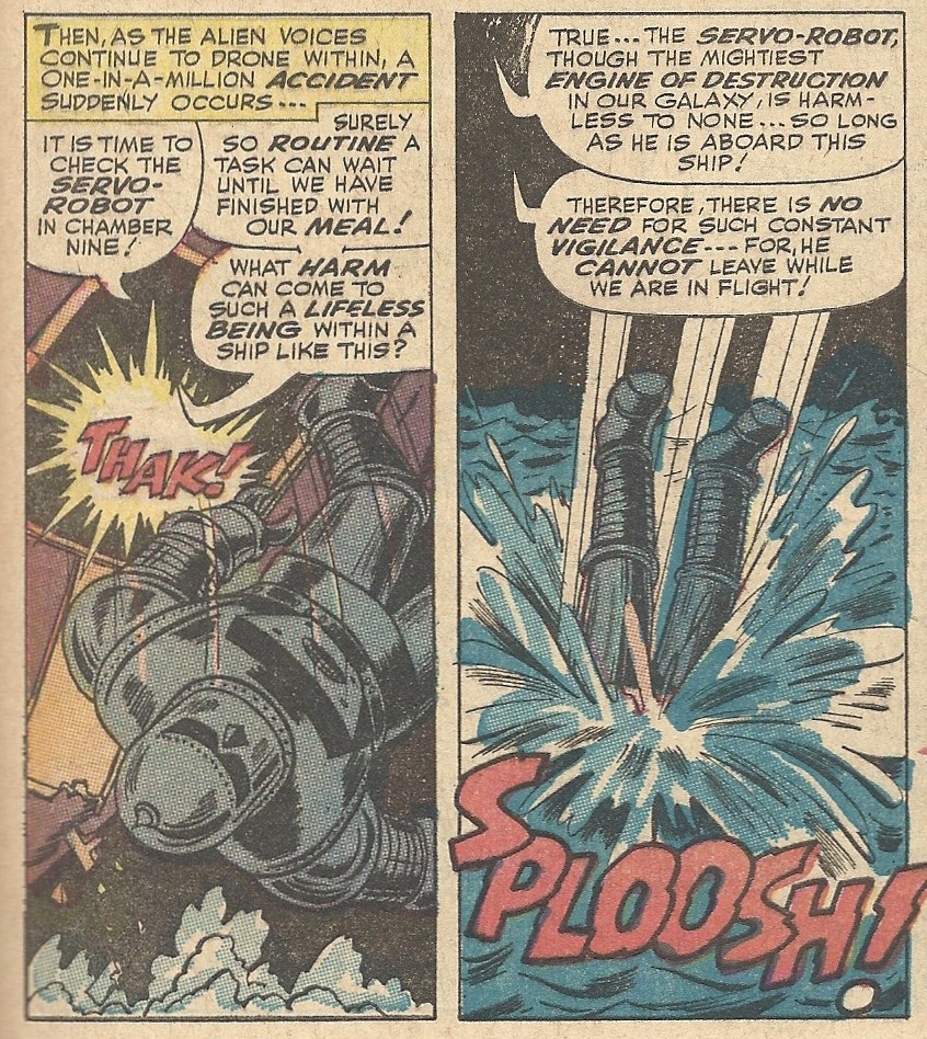 More on the pleasant surprise when I get to the Hulk story. First, a few words about the Namor installment, “A Stranger Strikes from Space!” by Stan Lee and Bill Everett. After battling his undersea nemesis, Attuma, and sending him away to lick his wounds (can you lick wounds underwater?), a passing alien spaceship has an “oops” moment and accidentally drops an unstoppable robot into Namor’s corner of the ocean: