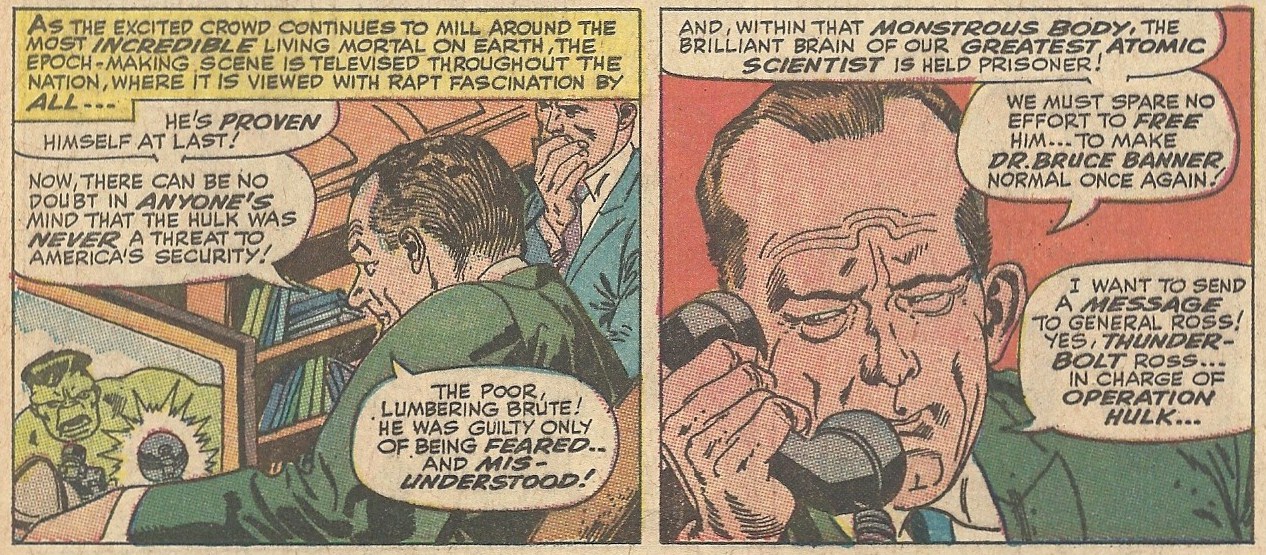 After defeating the Hulk-Killer, ol’ Greenskin is besieged by spectators and the media with their flashing cameras (much like King Kong). Watching on television is the leader of the free world: