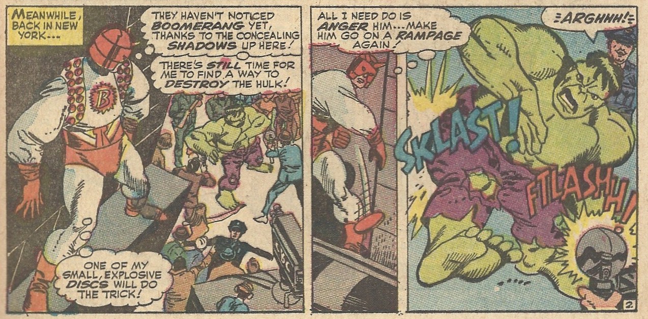 Anyway, a brightly costumed villain named Boomerang gets Hulk all riled up: