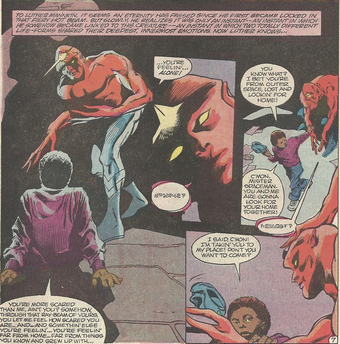 You have a young kid, Luther here instead of Elliot, and a somewhat frightened, very much out of place and telepathic alien in Jemm. Their relationship is, no surprise, at the heart of the series. Gene Colan and Klaus Janson did some really nice work together on the book – here’s a bit from the first meeting of our two main protagonists: