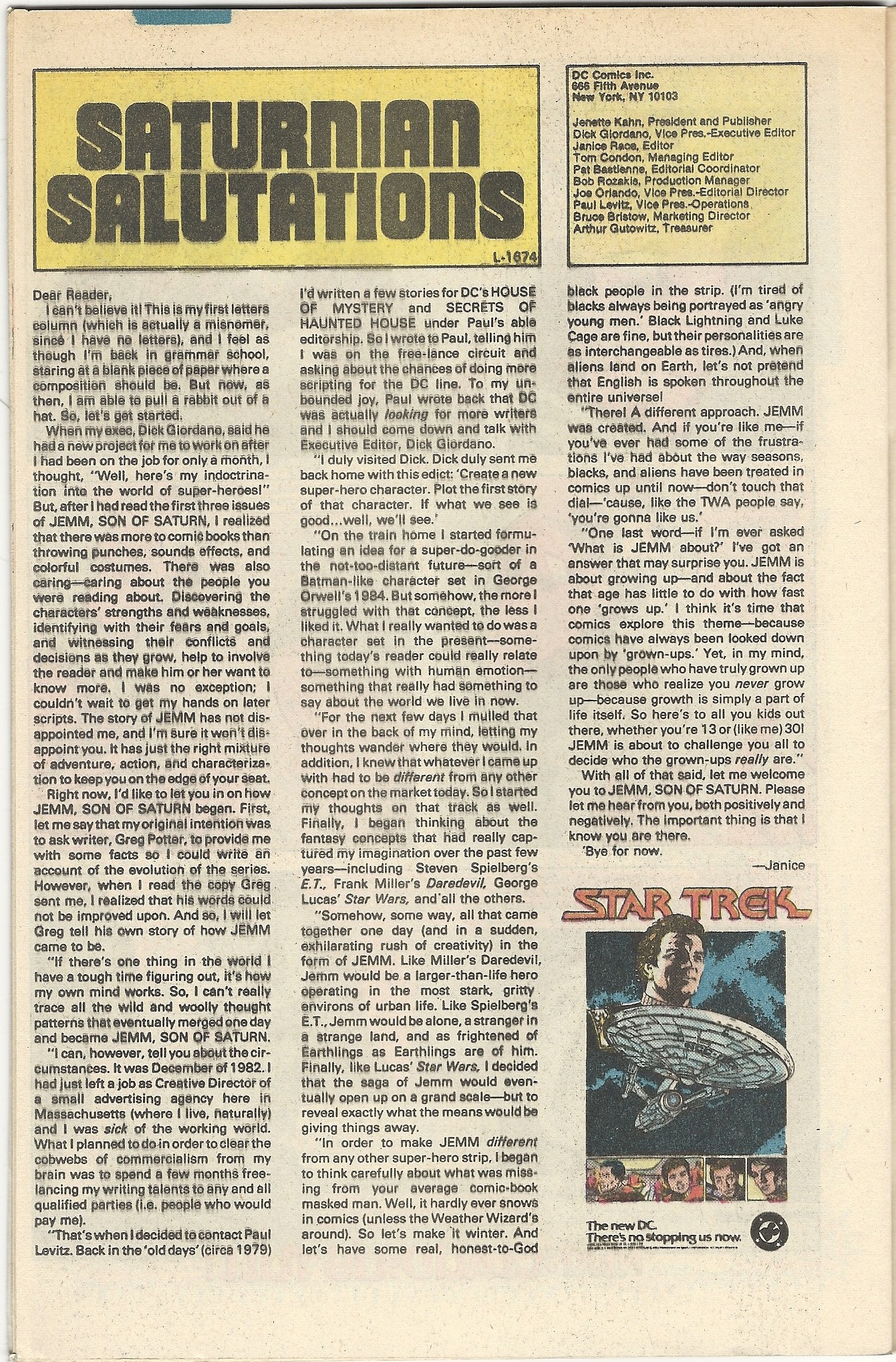 Jemm was a cool series and a cool character, but I do have a bone to pick with its author, the aforementioned Greg Potter. Here’s the end of issue piece on Jemm’s creation, with an extended quote from him: