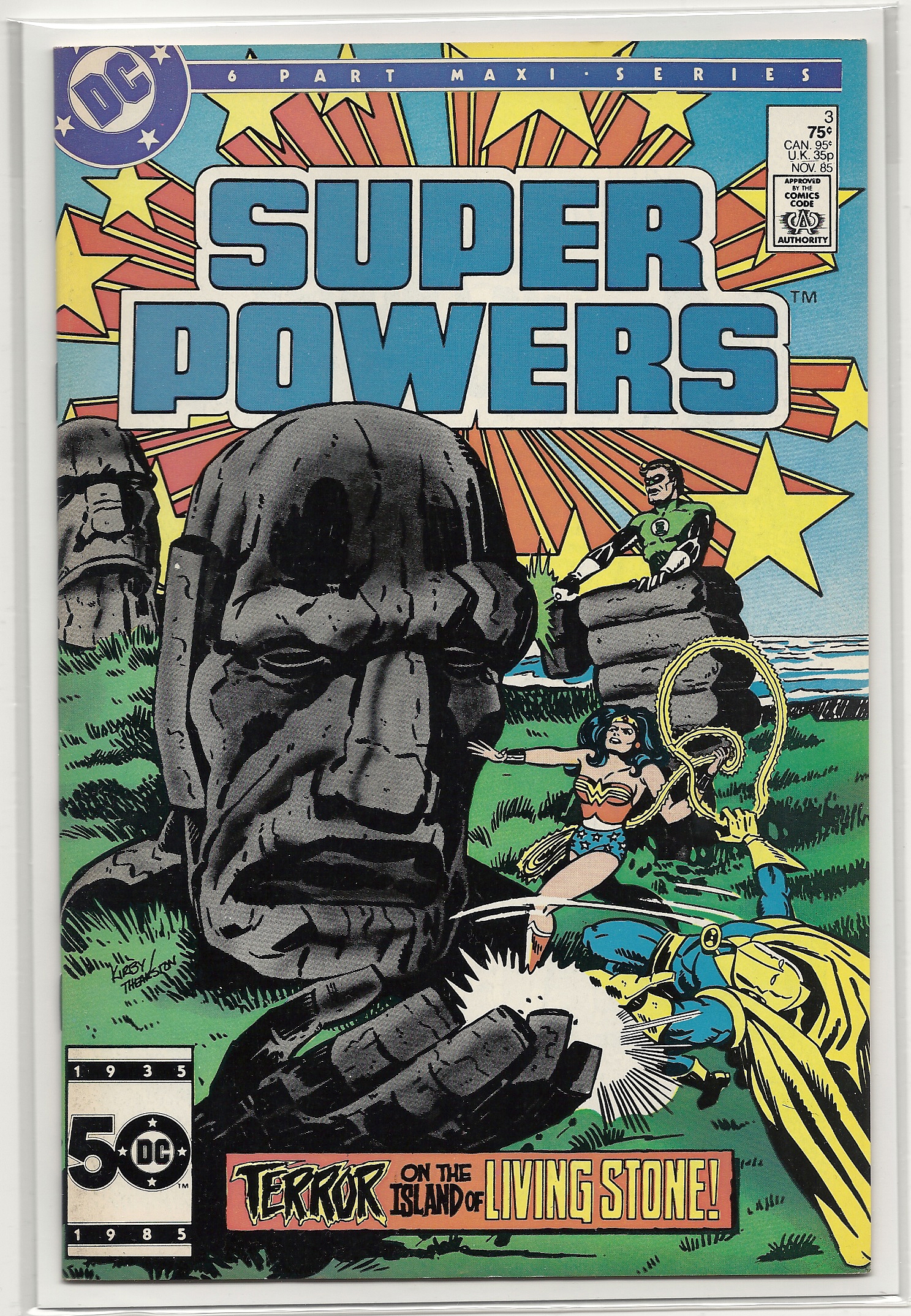 Here’s the gist of the plot and where the Moai come in. The cover is misleading as to their involvement – they don’t come alive and attack GL, WW and Dr. Fate. Instead our heroes are thrown back in time by a seed of doom or whatever the hell weapon Darkseid and his minions were using to destroy Earth this time around, and while there fend off an invasion of alien living stone giants bent on – you guessed it – conquering the Earth. Seems to be a popular idea. Our heroes get the job done, and when they return they find the natives in the past erected stone heads of them honoring there efforts, which GL promptly obliterates, leaving only the statues which are really just the giants that were frozen in their tracks. And on the miniseries goes from there. There are some time-travel conundrums created by all this that make my head hurt, so I won’t get into them right now. Suffice it to say I don’t think Kirby thought things through all the way before he sent this one to the printers.