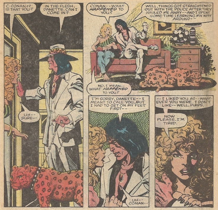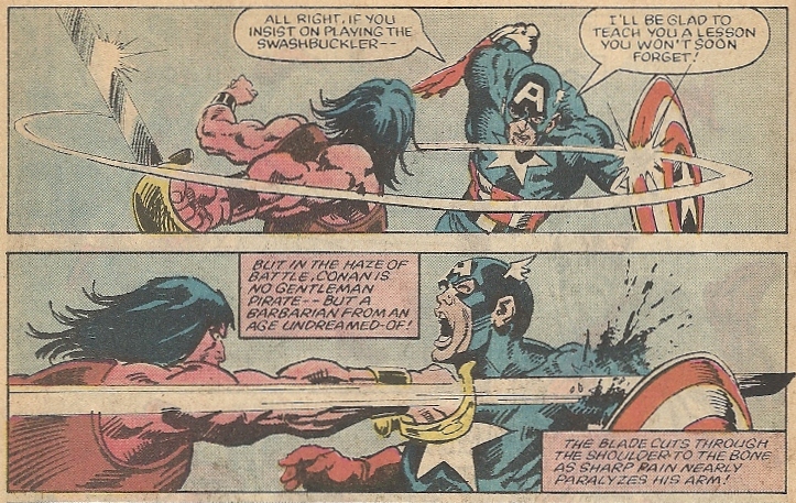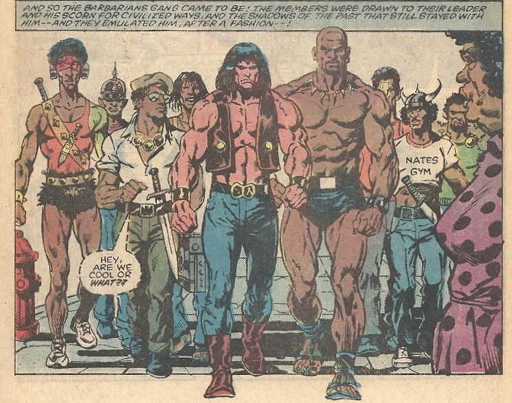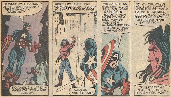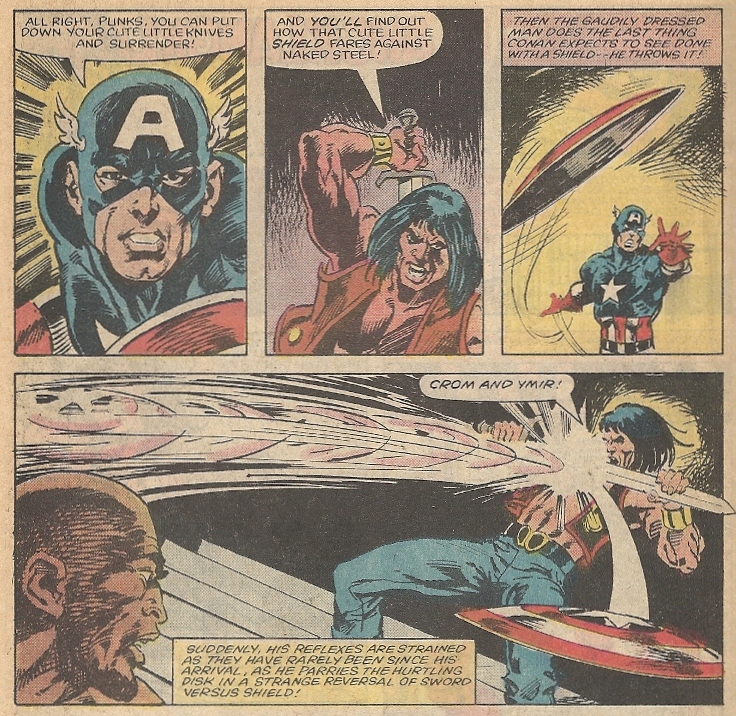 One of the most obnoxious things — and it’s possibly the best — about this issue is the thickly accented and slangified verbiage of Britannia. Conway crams in every last bit of it, like a man dying of thirst wringing out the last drops of moisture from a wet towel. You can get a glimpse of this barrage here, as Donald Blake, so hungry he can’t even include the “e” in “sandwiches,” orders some of that famous beige English cuisine: