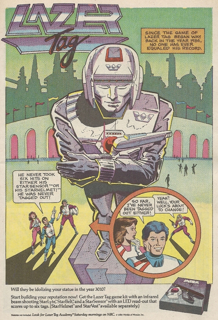 A buddy of mine had one of these things when we were kids. It was pure junk. You had to have the gun right next to the target doodad to register any sort of hit. Maybe he got a lemon, I don’t know. Whatever the case, it sucked. Lazer Tag actually spawned a short-lived animated series, but I don’t think we’ll be building any statues to talented practicioners any time soon.