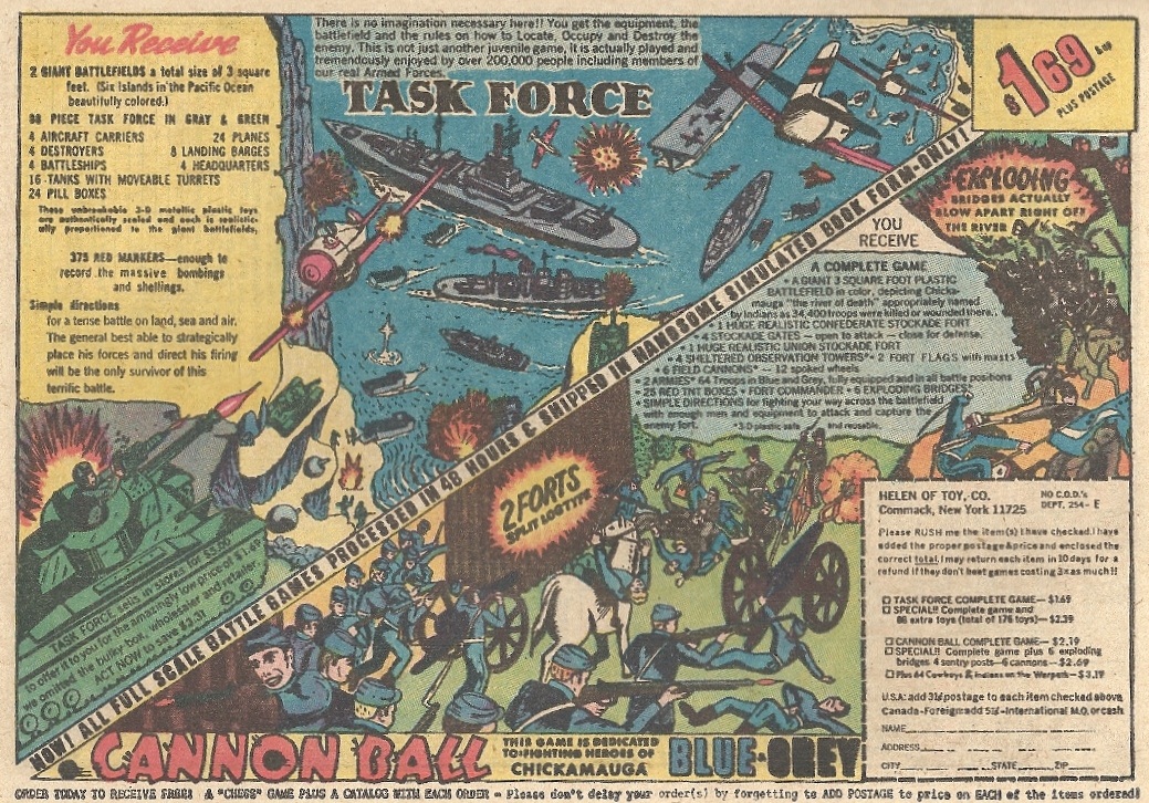 No matter how many accoutrements they might come with, boxes of static men could never get me going, even if they were incorporated into actual games like in this ad. I lacked imagination, I guess. They were great, however, for melting under a magnifying glass and getting swallowed by the dog. And I’m sure the heroes of Chickamauga up in Elysium are beaming with pride at the above tribute.
