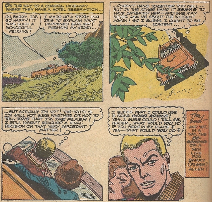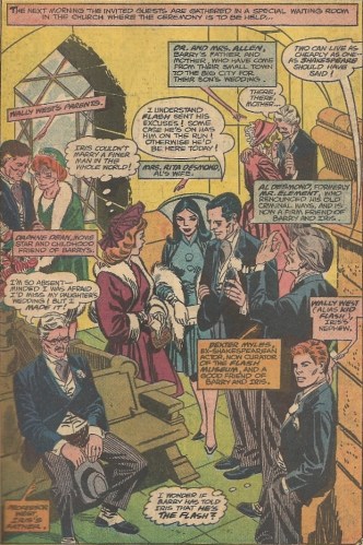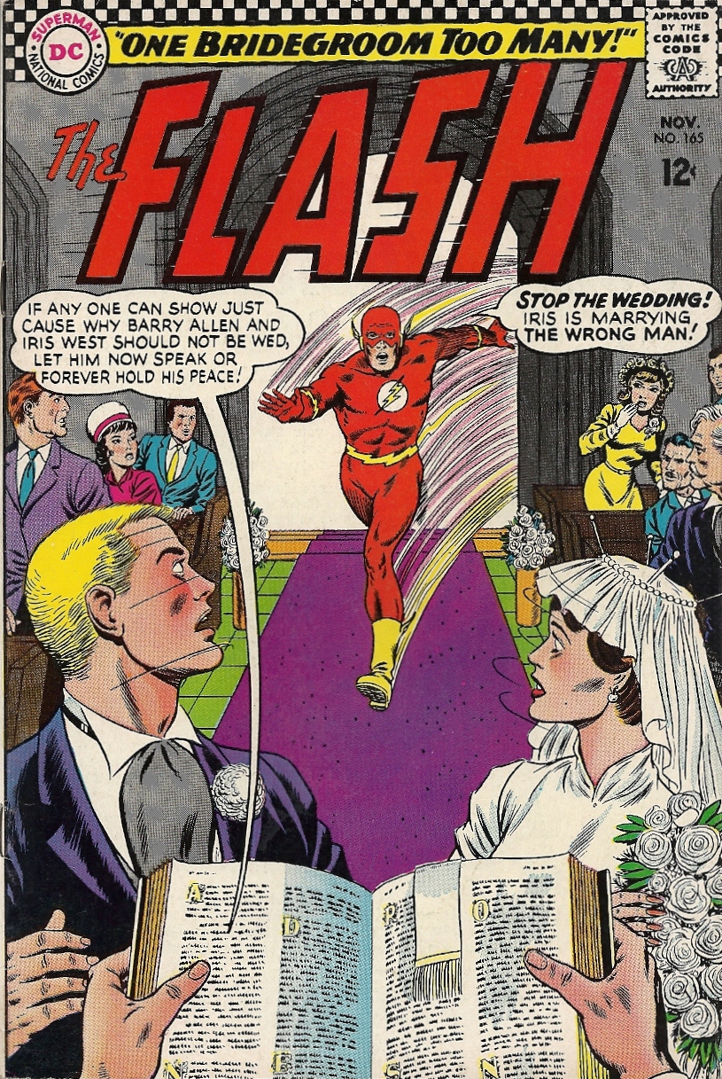 This selection, from deep in the blogintomystery.com archives (a locale guarded by a moat filled with snapping alligators), marks a seminal moment in the history of the Barry Allen Flash, as he weds his lady love, that nagging shrew, Iris West. His blushing, nothing-you-ever-do-is-good-enough bride. Mazel mazel, good things. And I shall refrain from making all Runaway Groom jokes in this post. YOU’RE WELCOME, PLANET EARTH.