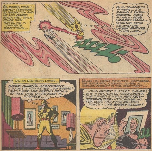 Let’s flash (no pun intended) back a little ways and forward a long ways. Professor Zoom was once again possessed by the urge to meddle in the affairs of his ancient history, and, envious of Barry Allen’s charmed existence, decided to assume his foe’s identity. To that end he sucked Barry to the 25th century (in a most gratifyingly Infantinoish manner) and did the old switcheroo: