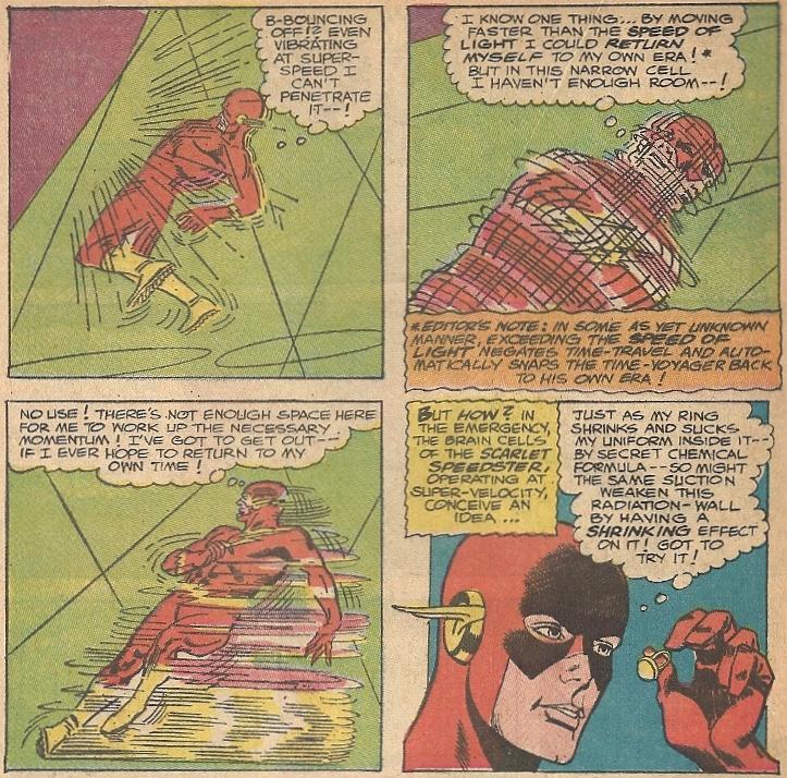 Zoom had gone full-bore in his new I.D., including some mild crime-fighting and going through with the wedding (though he didn’t look happy about the latter — perhaps he had an inkling of Iris’ acid tongue). At the same time in the future (only in the realm of comics can such a phrase exist), the real Flash used some bewilderingly questionable science to theorize about how to break out of his prison and return to his own time:
