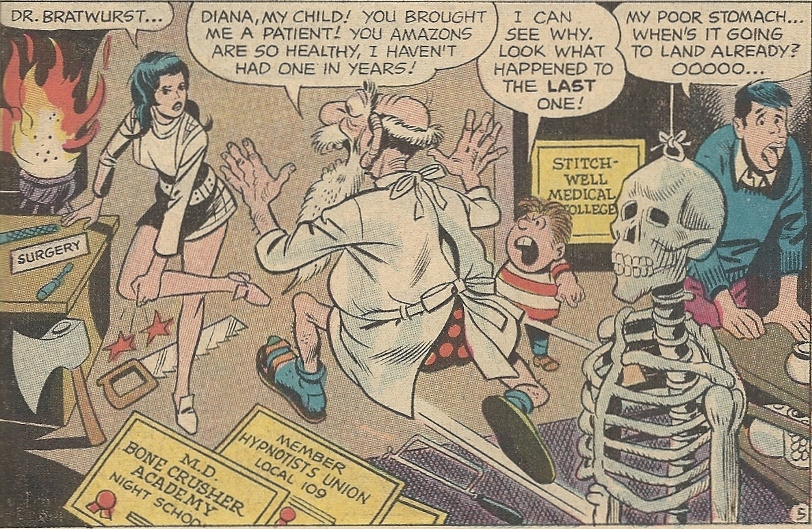 Whatever the case, when he drapes himself over the water Walter Raleigh-style to let her majesty walk over him, Diana slips and injures her knee. As I said, this was a low ebb for Diana. It’s off to Paradise Island (via a handy dimensional portal of sorts) to see a doctor, who looks to be a refugee from the Seven Dwarves: