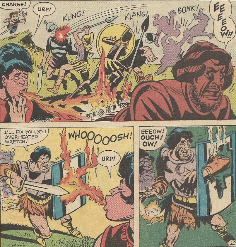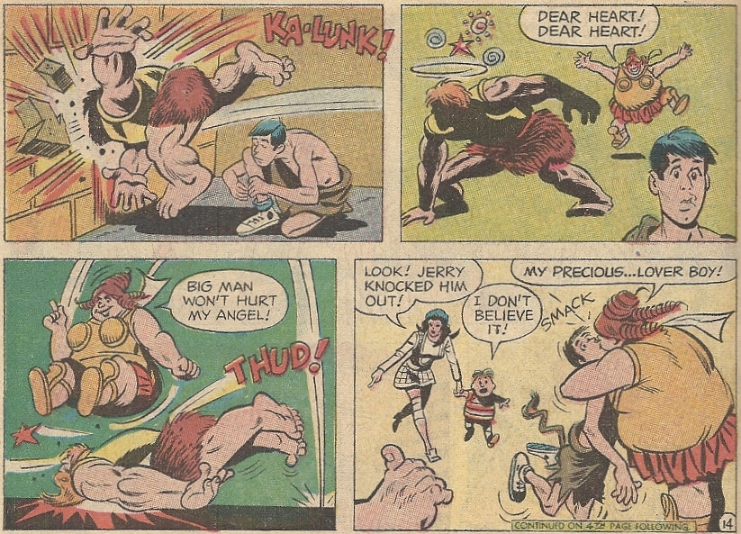 While Diana’s getting treatment she’s informed that an evil king (Zodor) has invaded the island in search of some sacred pearl, and has kidnapped her mother to further his nefarious schemes. And Jerry? Oh, he flops around the laboratory until he accidentally swallows a potion that makes him impervious to pain. This qualifies him as an ideal (really?) candidate to defeat the evil king and his henchmen: