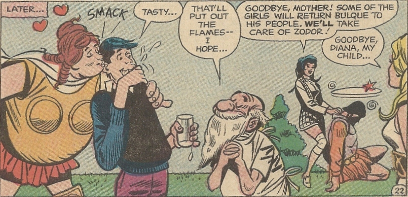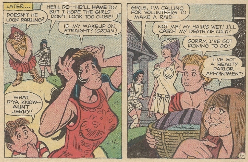 The battle is won, but not the war. They still have to beat Zodor, and to do that Jerry’s going to have to lead Amazons into battle. Since he’s a man (we think), he’s going to need to climb into a dress and a wig. While he’s doing that, Diana recruits some vapid Themyscirian dames for his “army:”